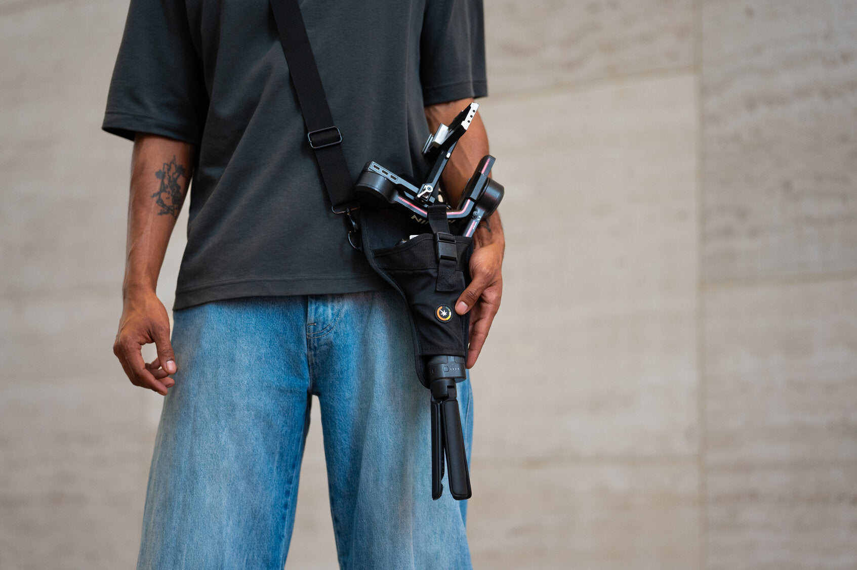 Introducing The Gimbal Holster – a premium carrying solution designed for filmmakers and videographers. Engineered for seamless mobility and ease of use, this holster provides a secure, hands-free way to transport your DJI Ronin RS3/4 Gimbal.